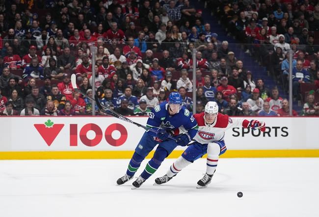 Studnicka put Vancouver up 5-4 lead 8:49 into the third, picking off Montembeault’s clearing attempt behind the Habs’ net and sending a shot up and under the crossbar before the goalie had a chance to get set back in his crease.