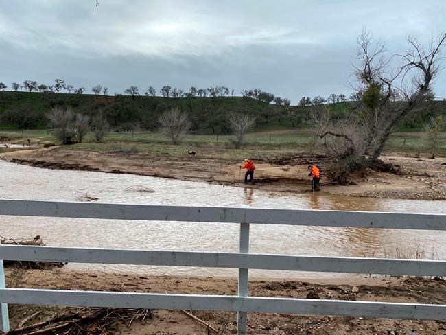 Scotty Jalbert, emergency services manager for San Luis Obispo County, said river crossings can be deceiving and people can run into trouble after successfully fording them several times. As little as 6 inches (15 centimeters) of water is enough to knock a person off their feet and can even push a car off course if it’s moving rapidly.