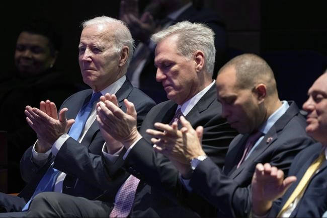 The event is designed to bring people together across partisan lines, and Biden sat next to House Speaker Kevin McCarthy, R-Calif. The two are beginning a showdown over whether to raise the country’s debt limit to avoid default.