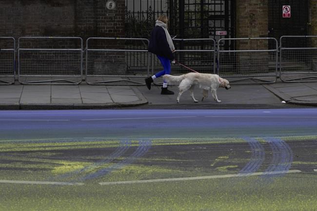 LONDON (AP) — British police said Thursday they have arrested four people after protesters painted a giant Ukrainian flag on the road outside the Russian Embassy in London.