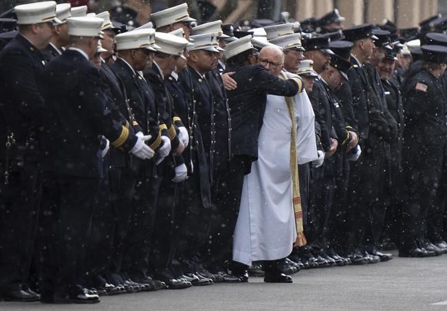 A light snow fell Friday as thousands of firefighters from around the country gathered outside the cathedral.