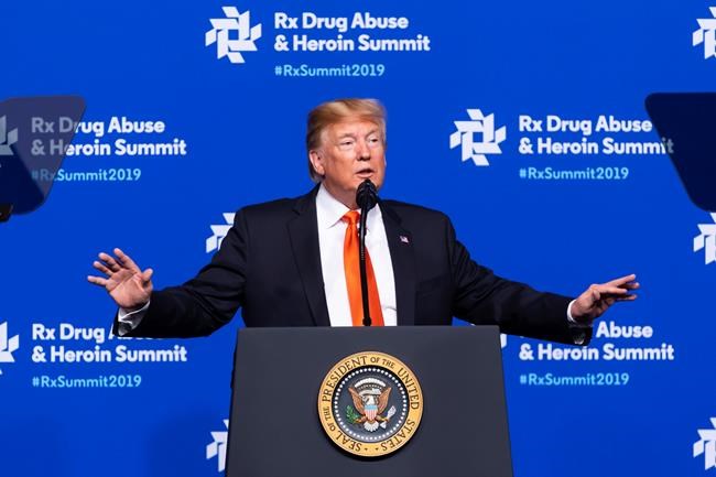 Trump spoke at an annual conference of health, law enforcement, elected and other officials who work to combat drug abuse and addiction, and used the appearance to advocate for the wall he wants to build on the U.S.-Mexico border, saying without evidence that it will help keep drugs out of the U.S. His wife, Melania, introduced him.
