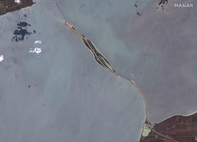Satellite images taken Monday morning by Maxar Technologies showed serious damage to both eastbound and westbound lanes of the bridge across the Kerch Strait on the part nearest to the Russian mainland, with at least one section collapsed. The railroad bridge that runs parallel to the highway appeared undamaged.