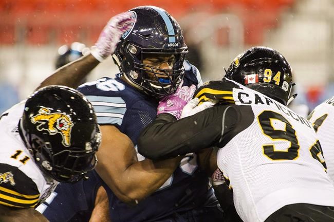 Toronto Argonauts tackle Isiah Cage will miss a third straight game with a thigh injury.