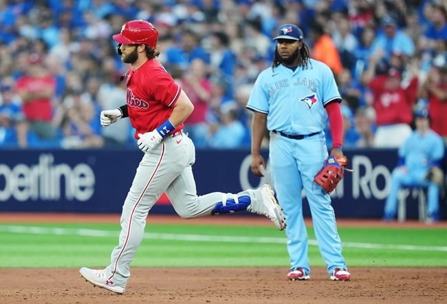 It looked like Stott had ground out to end the inning in the next at bat but Toronto third baseman Santiago Espinal missed the target and bounced the ball past the outstretched glove of Vladimir Guerrero Jr. at first. Harper and Castellanos took advantage of the throwing error to give the Phillies a 5-4 lead.