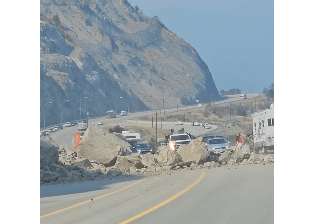 Rocks and debris fell onto Highway 97 north of Summerland this afternoon, Aug. 28, and traffic is being diverted to other routes, according to DriveBC.