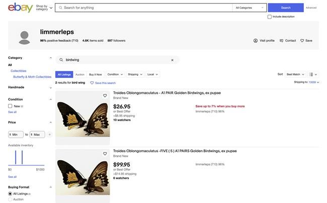 An eBay page of a seller going by “limmerleps” shows the account had made more than 4,600 sales on the shopping platform, many of the most recent sales were moths and butterflies. There were two birdwing specimens currently on sale and two were sold over the past year, according to the website.
