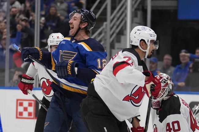 ST. LOUIS (AP) — Kevin Hayes scored a pair of goals and added an assist to help the St. Louis Blues beat the New Jersey Devils 4-1 on Friday night.