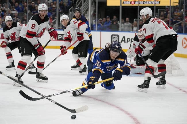 ST. LOUIS (AP) — Kevin Hayes had two goals and an assist, Jordan Binnington stopped 34 shots and St. Louis beat New Jersey.