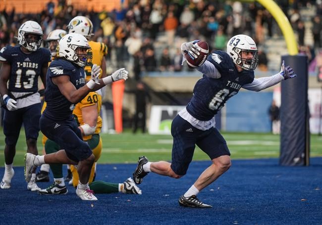 VANCOUVER – Wide receiver Sam Davenport hauled in a last-second touchdown as the University of British Columbia Thunderbirds staged a late comeback to beat the University of Alberta 28-27 and win the Hardy Cup.