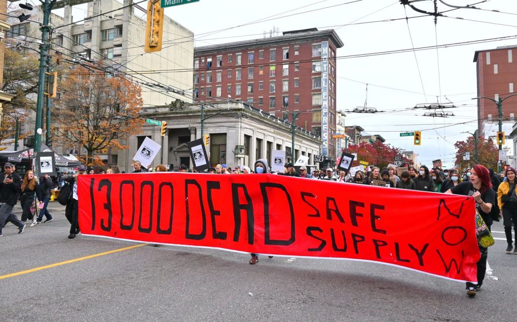 The rally, which drew around 400 participants, marched with a giant red banner which read “13,000 dead. Safe supply now.”