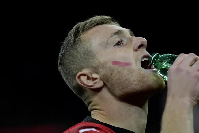 ROME (AP) — Players and coaches across the top men’s soccer league in Italy had red marks painted on their faces to promote a campaign for the elimination of violence against women on Saturday.