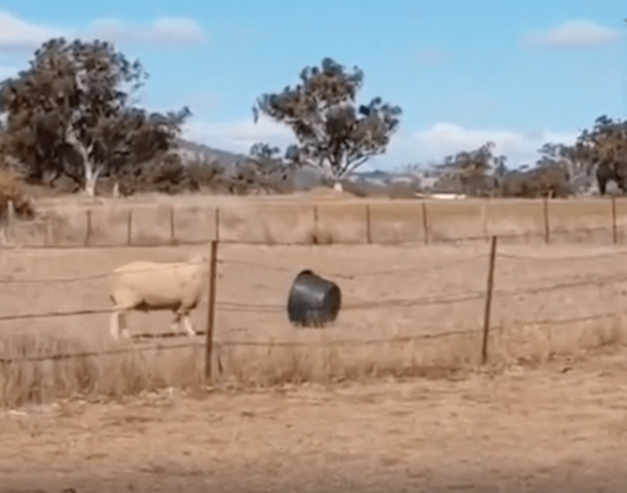 A sheep squares off with its arch-nemesis: the bucket.