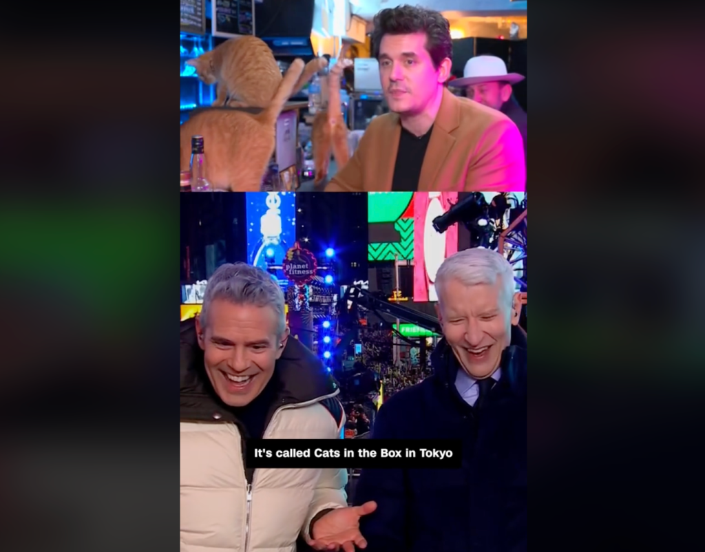 @cnn Musician John Mayer joined CNN’s New Year’s Eve show from a cat cafe in Tokyo, sending host Anderson Cooper into fits of laughter. #cnn #nye #catcafe #andersoncooper #johnmayer ? original sound – CNN