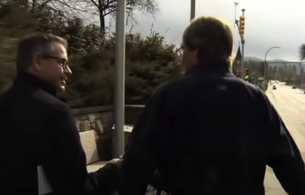 Television reporter Kent Molgat was interviewing a lawyer outside the Vernon courthouse and had a close encounter with a large metal pole.