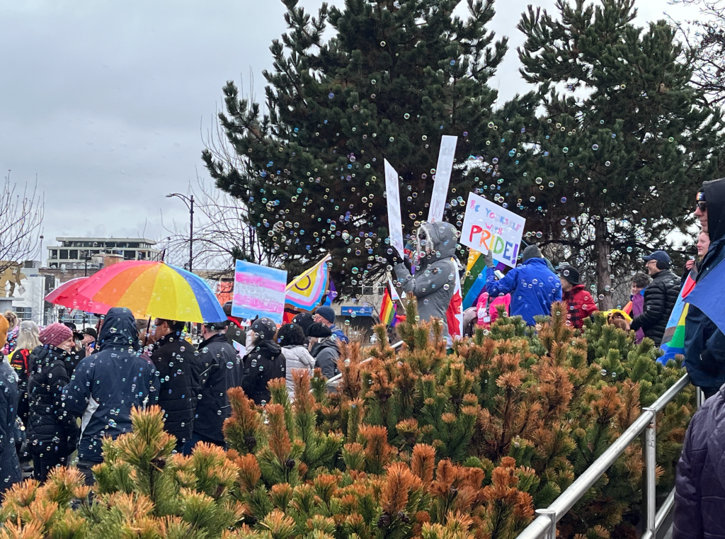 Roughly 50 people stood in the rain at Stuart Park in high spirits, shooting bubbles and blasting music for Advocacy Canada’s Rise Up with Alberta Trans Solidarity Rally.