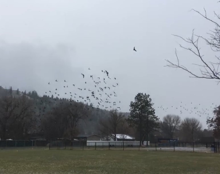 Starlings burst into a grey, overcast sky in Kamloops filling the air with the sounds of flapping wings as they grouped together and moved in intricate formations and disperse in this video taken over the weekend.