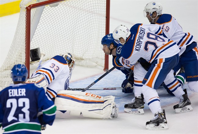 Goalie Ryan Miller was forced to look sharp early in the second with the Oilers’ top line buzzing in the Canucks zone. He made a big stop on a backhanded shot from Pouliot off a breakaway. Edmonton outshot the Canucks 14-7 in the period.