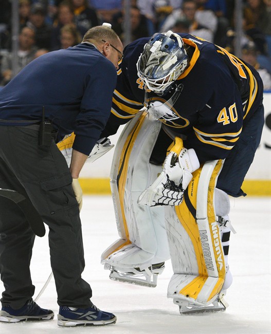 The injury means the Sabres will proceed with backup Chad Johnson and minor-league call-up Nathan Lieuwen. Johnson had 27 saves in a 4-1 loss to Tampa Bay on Saturday.