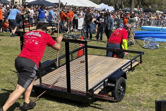 The games kicked off Saturday with the “Star Spangled Banner” played on electric guitar. Then spectators sipping canned beers behind metal barricades cheered and frequently shouted expletives as a dozen teams battled in contests inspired by real events from America’s most surreal state.