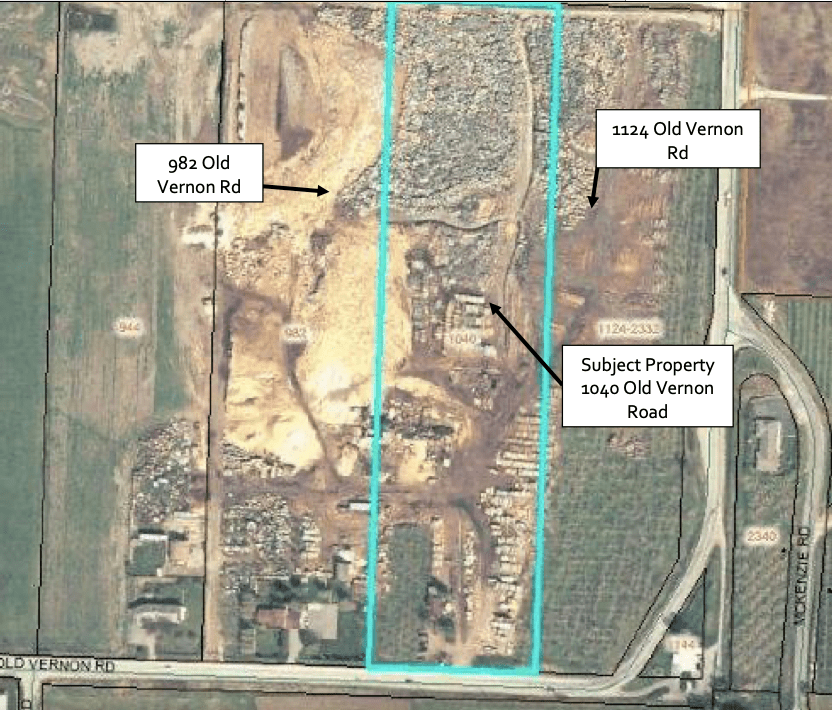 Materials from the sawmill were placed on 982 Old Vernon Road, next to the site where the stop work order was issued, which now has a different owner than 1040 Old Vernon Road. There are two other properties on either side of those lots at the bend where Old Vernon Road turns north towards Kelowna Airport.