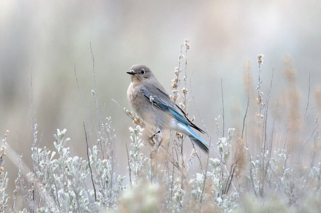 Mountain bluebirds are small thrushes with round heads and thin bills, and are lankier and longer-winged than other bluebirds. The males are bright blue with pale white on the underside and the female grey and brown.