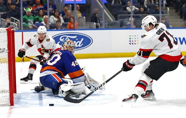 NEW YORK (AP) — Brady Tkachuk scored on the power play in overtime to complete a hat trick and Joonas Korpisalo made 30 saves to help the Ottawa Senators beat the New York Islanders 4-3 on Saturday.