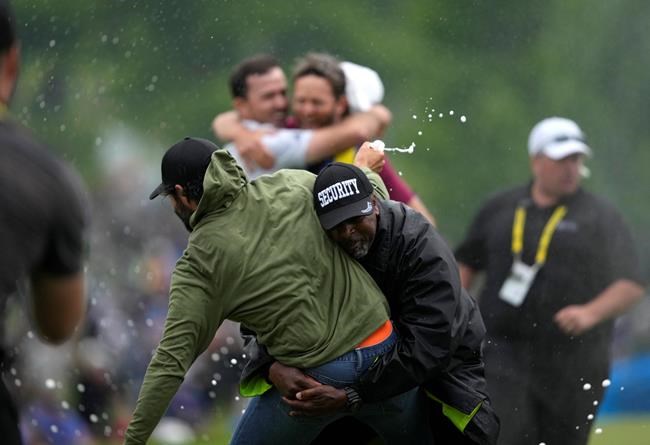 Photographer Darren Calabrese is nominated in the feature photo category for a snapshot of a woman waving goodbye to her husband while the HMCS Montreal readies for departure in Halifax, while photographer Andrew Lahodynskyj is nominated in the sports photo category for an image of Adam Hadwin being tackled at the Canadian Open as Nick Taylor celebrated his historic win.