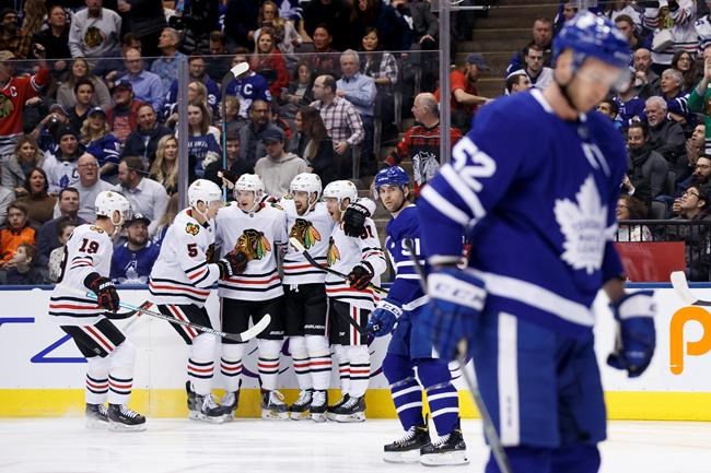 Jonathan Toews scored twice as part of a four-point night as the Chicago Blackhawks raced out to an early lead and never looked back in a 6-2 romp over listless, disinterested Toronto.