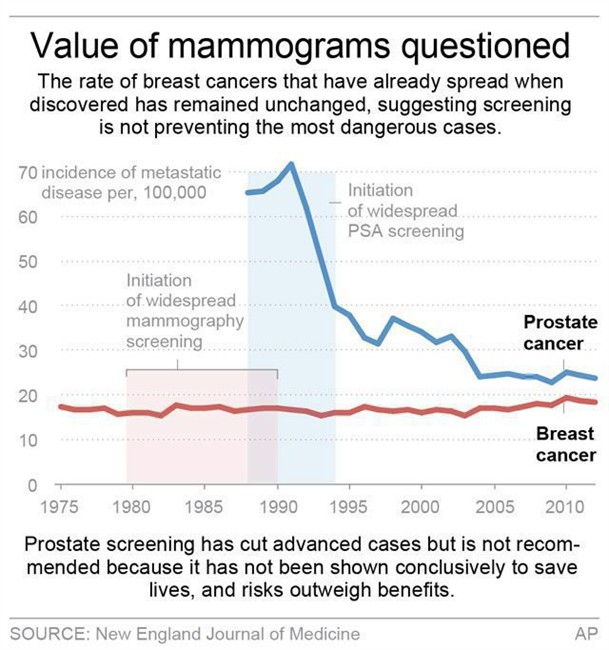 “I wouldn’t want to say it has had no effect but it certainly has not lived up to the anticipated effect,” he said. For every tumour detected early because of mammography, “you would hope to see … an equal reduction in metastatic disease, and that has not occurred.”