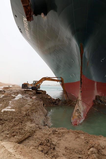 SUEZ, Egypt – The company that owns the giant container ship stuck sideways across the Suez Canal said an attempt will be made to refloat the vessel by taking advantage of tidal movements later Saturday.