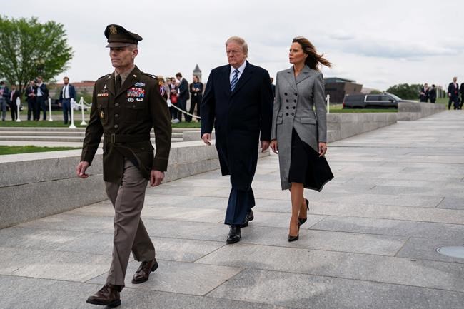 The president and first lady Melania Trump participated in a wreath-laying ceremony and toured the memorial. They paused in front of a wall of stars with the phrase “Here we mark the price of freedom,” before they returned to the White House.