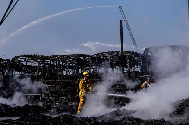 COMPTON, Calif. – A huge fire visible across Los Angeles burned stacks of pallets in a commercial yard and buses parked in a neighbouring lot Friday.