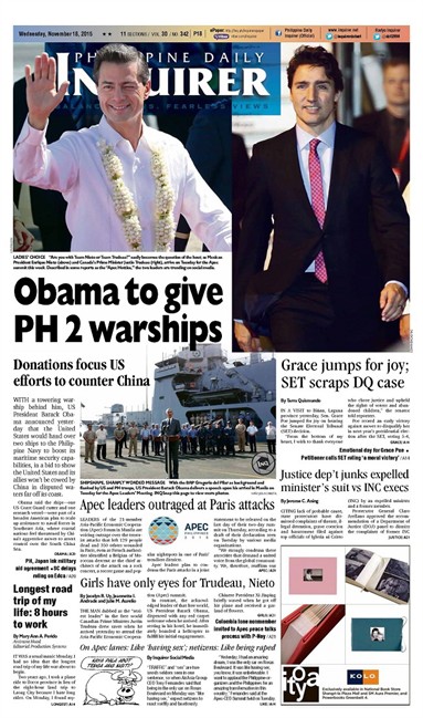A pair of large photos of the two leaders filled the top half of the Philippine Daily Inquirer broadsheet.