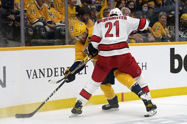 The Hurricanes also escaped a penalty when officials wiped out a double minor after a review showed Predators forward Eeli Tolvanen was caught first by teammate Mattias Ekholm’s stick before Carolina forward Andrei Svechnikov’s stick hit his face with 80 seconds left in the first. Officials are not allowed by rule to call another penalty in that situation.