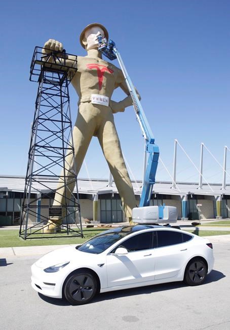 The 75-foot tall statue in the heart of the city is getting a makeover that includes a bright-red Tesla logo on its chest and a mask to make the oil field worker resemble Tulsa CEO Elon Musk. City officials plan to unveil the new look at a press conference Wednesday afternoon.