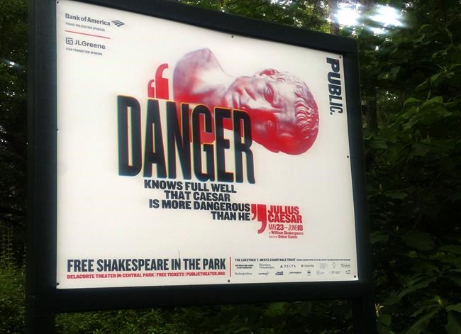 NEW YORK – A New York production of Shakespeare’s “Julius Caesar” with a Trump-like character who is assassinated had a boisterous new scene this weekend: an activist who stormed the stage, yelling, “Do you want Trump to be assassinated?”