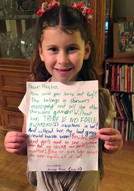 Goldman posted Annie Rose’s letter on Twitter in January 2016. In it, the then-8-year-old asks why Hasbro left out Rey from the set based on “Star Wars: The Force Awakens” when she’s a main character, crucial to the story.