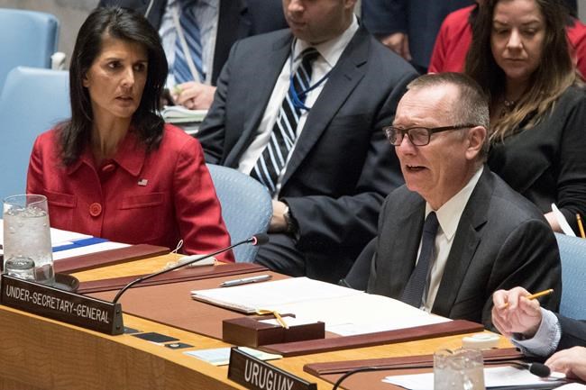 The U.S. ambassador to the United Nations says that while the Syrian government is responsible for Tuesday’s chemical attack, Iran and Russia bear “heavy responsibility” for propping up and shielding President Bashar Assad.