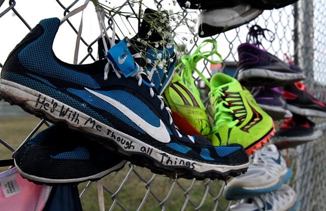 Many in the crowd wore pink and purple — Gay’s favouritecolours — with some holding balloons of those same hues that were later released into the air. Several pairs of track spikes hung from a fence along with a baton that said In Memory of Trinity.