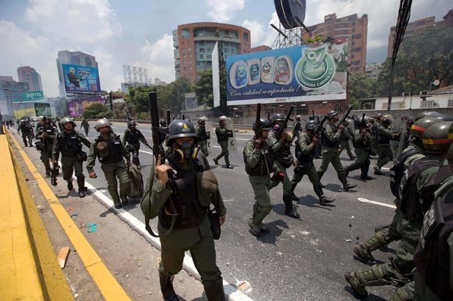 CARACAS, Venezuela – Thousands of protesters demanding new elections faced off with security forces who launched tear gas and stood shoulder-to-shoulder blocking roadways in the Venezuelan capital Monday.