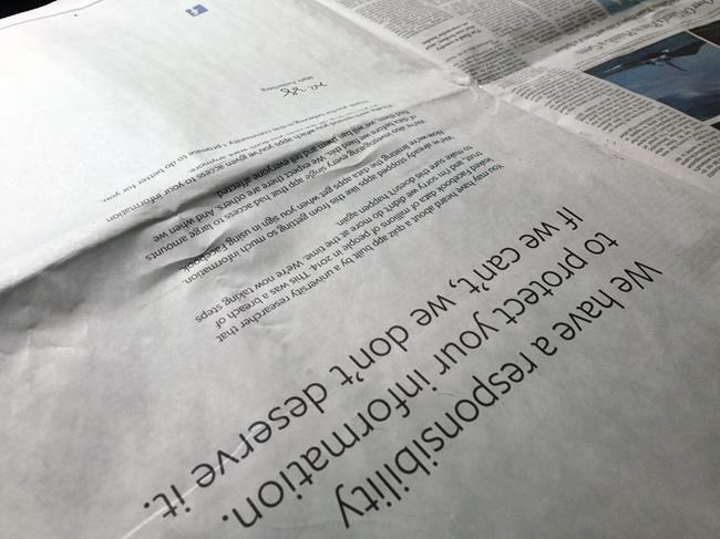 NEW YORK – Facebook’s CEO apologized for the Cambridge Analytica scandal with ads in multiple U.S. and British newspapers Sunday, saying the social media platform doesn’t deserve to hold personal information if it can’t protect it.