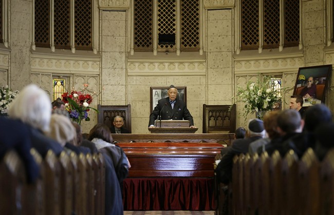 Those who spoke at the memorial, where a large picture of Vigoda rested beside white flowers and before the crowd, included former New York City Mayor David Dinkins.