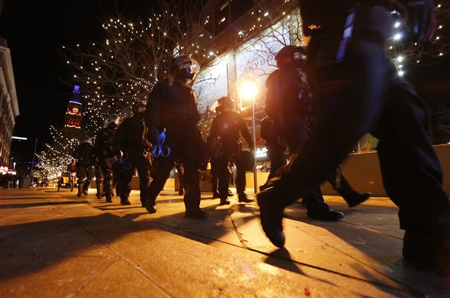 The Denver Post reports police used pepper spray on some people, and a window on a police cruiser was shattered in an area where people tossed trash cans in the street.