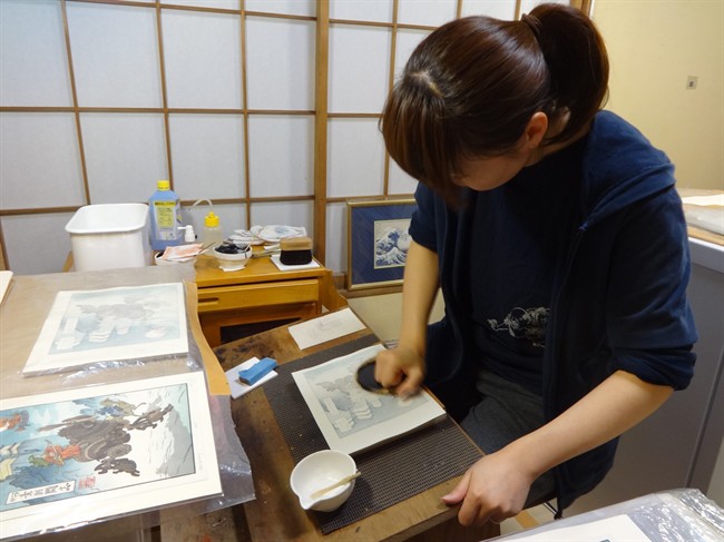“It’s the old ukiyo-e quartet,” Bull said: the boss, the designer, the carver and the printer. He is both boss and carver for this shop, but insists, “I’m not an artist.”