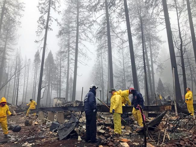 Crews resumed the grim work Saturday as rain cleared out of the devastated town of Paradise. Some were looking through destroyed neighbourhoods for a second time as hundreds of people remain unaccounted for. They were searching for telltale fragments or bone or anything that looks like a pile of cremated ashes.