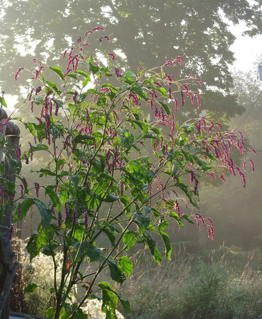 Let’s move on to the pink flowers of kiss-me-over-the-garden-gate (Polygonum orientale). At first blush, this plant can be a bit frightening because it looks like a familiar weed, smartweed, which spreads far and wide. Actually, it looks like smartweed on steroids, because kiss-me-over-the-garden-gate can grow 8 feet high. But it is better behaved than its weedy lookalike, self-seeds with discretion and, with much larger flowers held up higher, is prettier.