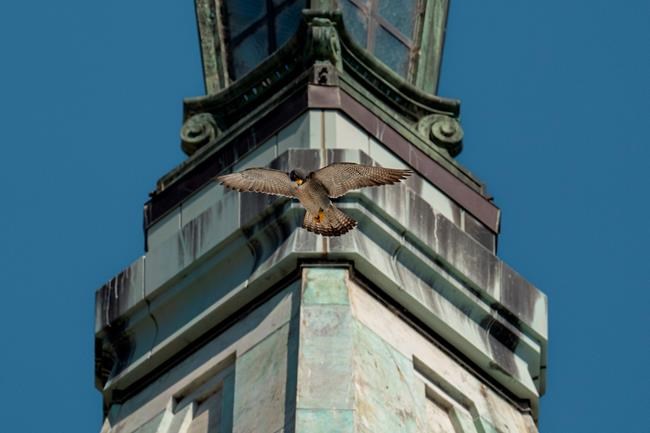 SAN FRANCISCO (AP) — A peregrine falcon whose longtime mate died this week amid the breeding season appears to have found a new partner to help her hatch two eggs.