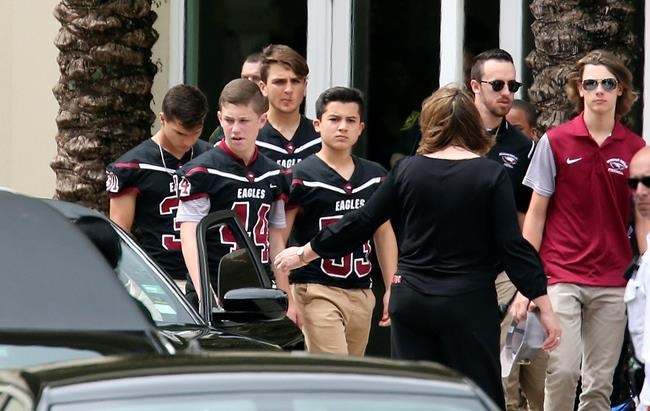 Football players wearing Stoneman Douglas jerseys carried Feis’ casket into the Thursday service at the Church of the Glades in Coral Springs where family and friends gathered to remember him as loyal and caring.