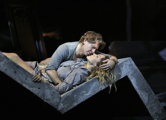 In the novel and the Puccini opera (though not in Massenet’s version), the beautiful Manon dies of thirst and exhaustion after being deported to America as a prostitute and winding up in a mythical wilderness or desert outside New Orleans. The Met’s production updates the action to World War II-era France, and for the last scene set designer Rob Howell has created a symbolic wasteland, littered with chunks of concrete from previous sets.